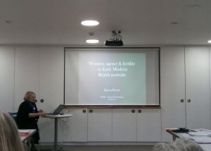 After tea and coffee conference organizer Miriam al Jamil introduced the keynote. Karen is a former Curator of 16th and 17thC British Art at Tate and is currently Honorary Professor at UCL. At Tate she curated several major exhibitions and is now planning a project on early modern representations of pregnancy for early 2019. Karen gave a wide-ranging and fascinating talk focusing on painted portraits of elite British women. She suggested the difficulties of researching these images, as few sources such as diaries or account books that might explain the intention behind and reception of these portraits survive, and the portraits themselves are constructs, the product of decisions as to what to include as well as what to leave out, and thus can be misleading. Nevertheless, we can learn a lot by looking closely and critically at these images.