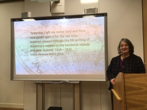 Trudie Messent presented on a WSG panel for the first time. Her paper was titled ‘Yesterday I left my native land and have now gazed upon it for the last time’: Isolation viewed through the life writing of Missionary wives in the Sandwich Islands and New Zealand, 1819-1832’. Trudie examined both the harsh physical journey and the emotional one which young newly-married wives experienced as they adjusted to life on the other side of the globe. She suggested that the letters and descriptions written by her subjects had a cathartic effect in the absence of social contact that their new lives entailed. Trudie’s paper was accompanied by some beautiful slides, showing routes taken, portraits and scenes which enriched the descriptions and quotations in her paper.